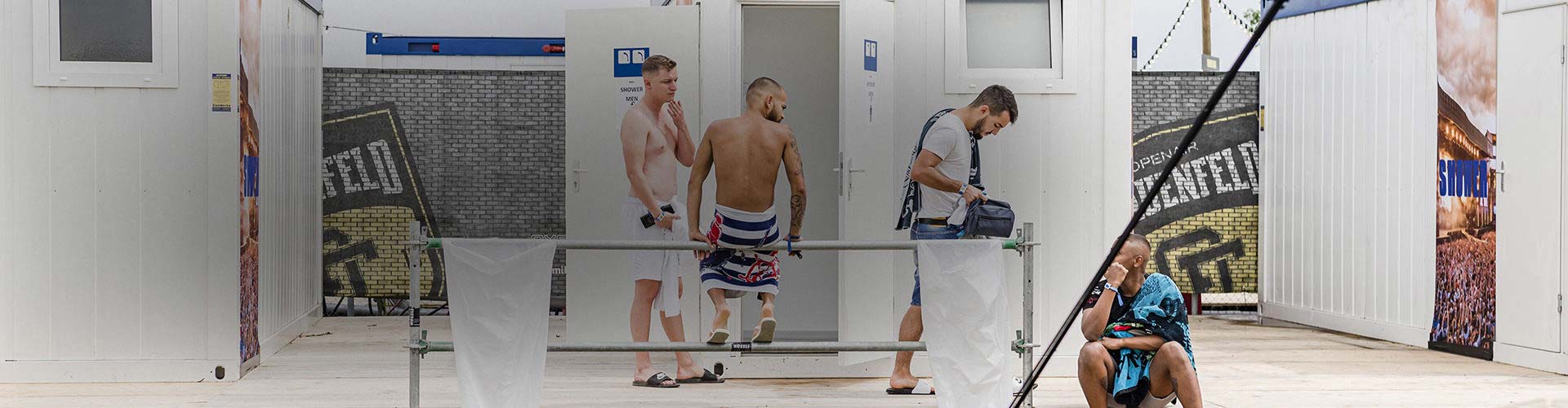 Le nostre strutture per docce sono particolarmente stabili e resistenti e presentano dieci postazioni doccia. Le pareti divisorie e le tende doccia creano cabine doccia separate. Le pareti esterne e quelle divisorie sono realizzate con pannelli di poliuretano.